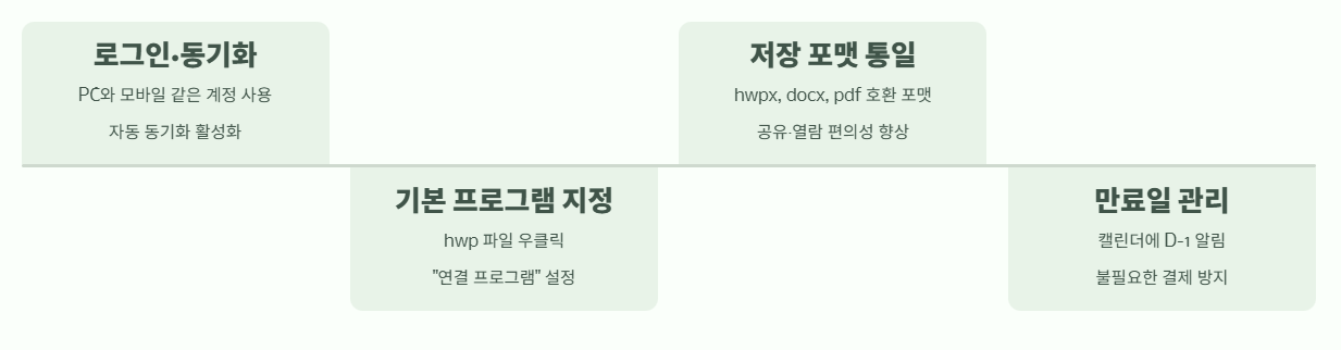 - 저장 포맷 통일: 가능하면 hwpx, docx, pdf 등 서로 호환이 좋은 포맷을 기준으로 저장하면, 다른 오피스나 웹 서비스에서도 열기·공유가 훨씬 수월해집니다.