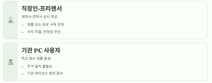 - 직장인·프리랜서: 계약서·견적서·보고서에 hwp를 상시 쓰고, 결과물이 수익과 직결된다면 정품 또는 한컴독스 유료 구독을 전제로 계획하는 것이 안전합니다.