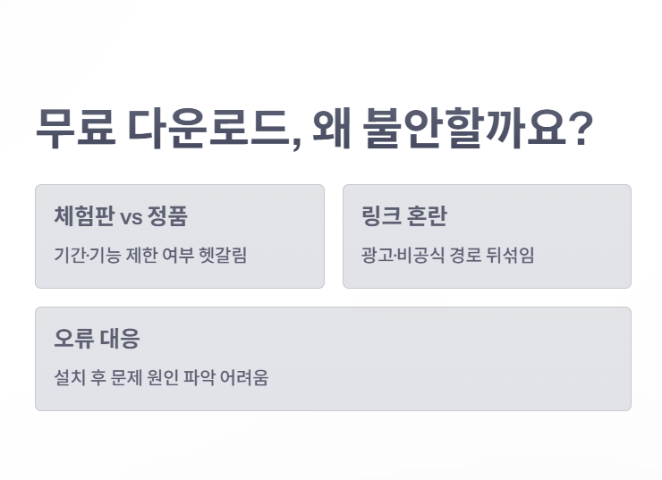 - “무료”라고 적혀 있지만 실제로는 기간·기능 제한이 있는 체험판인지 헷갈리는 경우