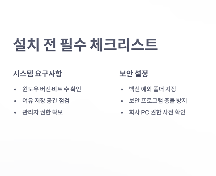 A. 윈도우 버전·비트 수, 저장 공간, 관리자 권한, 보안 프로그램 설정 네 가지를 먼저 확인해 두면 설치 성공률이 크게 올라갑니다. 이 네 가지만 체크해도 설치 중간에 멈추는 상황을 상당 부분 줄일 수 있어요.