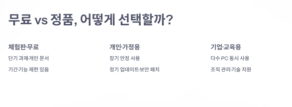 - 무료와 정품, 단기·장기 사용에 따라 어떤 선택이 유리한지 기준을 제안합니다.