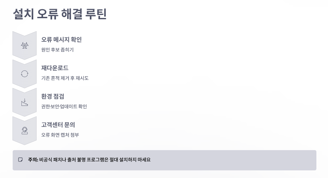 대부분의 오류는 설치 파일 손상, 권한 부족, 윈도우 업데이트 미적용, 보안 프로그램 충돌 같은 몇 가지 이유 안에 들어갑니다. 아래 순서를 따라가면서 내 환경과 맞는지 하나씩 확인해 보면, 막연한 불안 대신 구체적인 해결 방향이 보이실 거예요.