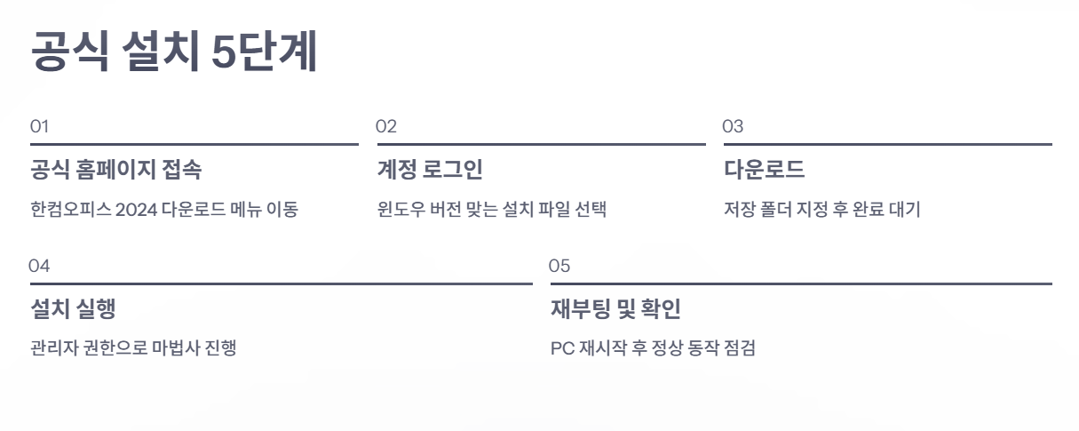 한글 2024 무료 설치 과정을 포함한 한컴오피스 2024 공식 설치 방법은 다섯 단계로 나누어 생각하면 훨씬 단순해집니다.