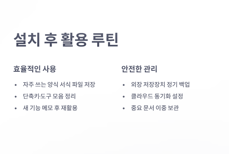 반복해서 사용하는 양식은 미리 저장해 두고, 자주 쓰는 기능은 단축키·도구 모음으로 정리해 두면, 작은 문서 하나를 만들 때도 매번 새로 시작하는 수고를 덜 수 있습니다. 설치에 들인 시간을 생각하면, 이 단계에서 몇 가지만 정리해 두는 것만으로도 체감 효율이 크게 달라질 거예요.