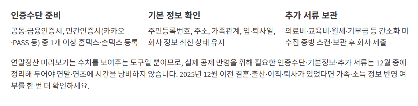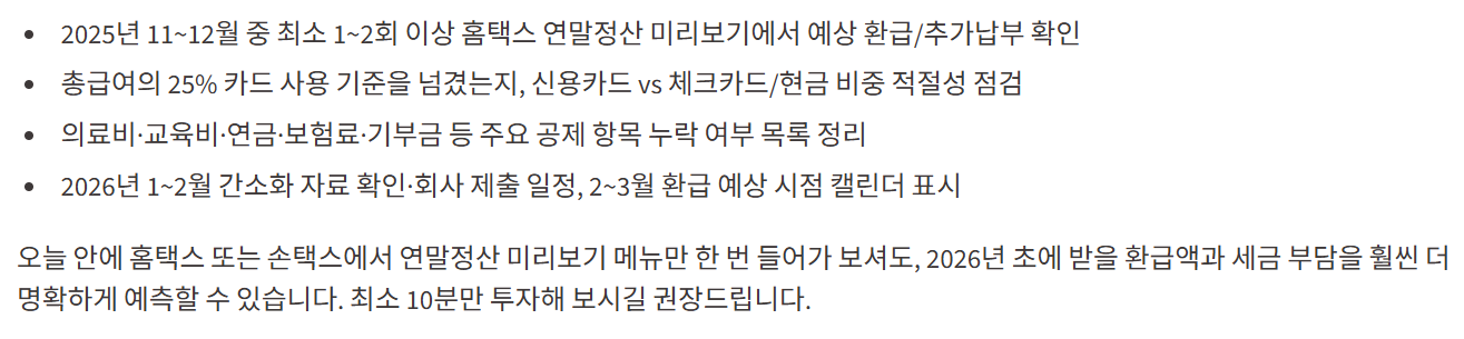 - 2025년 11~12월 중 최소 1~2회 이상 홈택스 연말정산 미리보기에서 예상 환급/추가납부를 확인했는지 체크합니다.