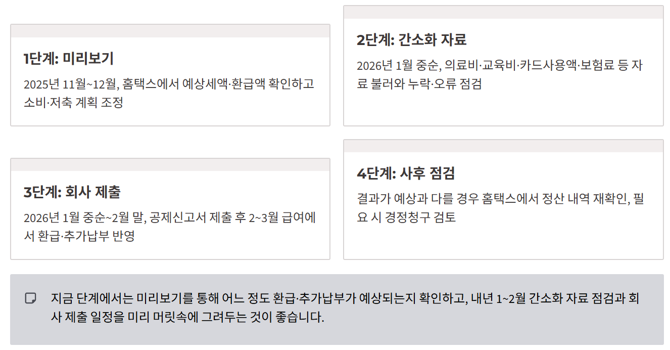 - 1단계 – 미리보기 : 2025년 11월~12월, 홈택스에서 예상세액·환급액을 확인하고 소비·저축 계획을 조정하는 단계입니다.