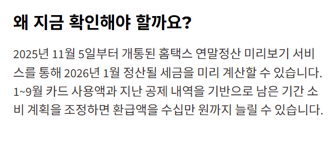 2025년에는 홈택스 연말정산 미리보기 서비스를 통해 2026년 1월에 정산될 세금을 지금 미리 계산할 수 있습니다.