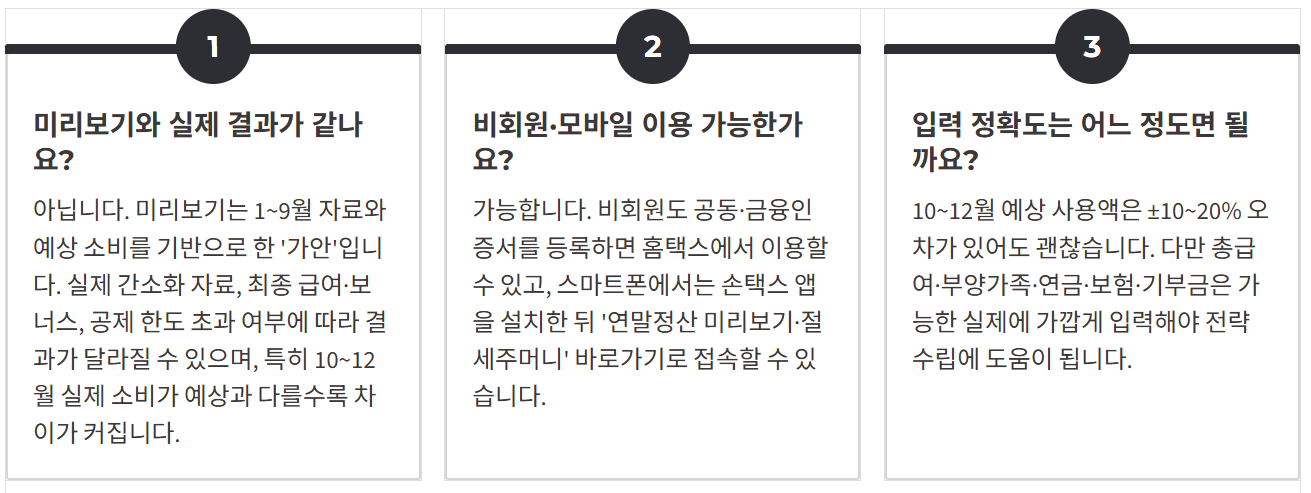 - Q. 총급여·카드 사용액을 어느 정도까지 정확히 입력해야 하나요? A. 미리보기의 목적은 대략적인 환급·추가납부 규모와 카드 사용 전략을 결정하는 것이므로, 10~12월 예상 사용액은 ±10~20% 정도 오차가 있어도 괜찮습니다. 다만 총급여·부양가족·연금·보험·기부금 등은 가능하면 실제에 가깝게 넣어야 전략 수립에 도움이 됩니다.