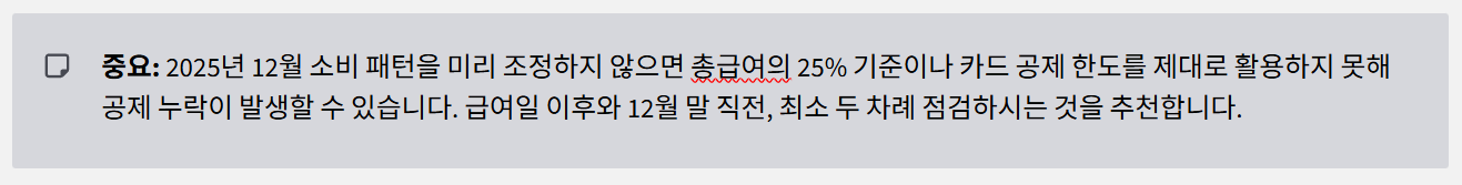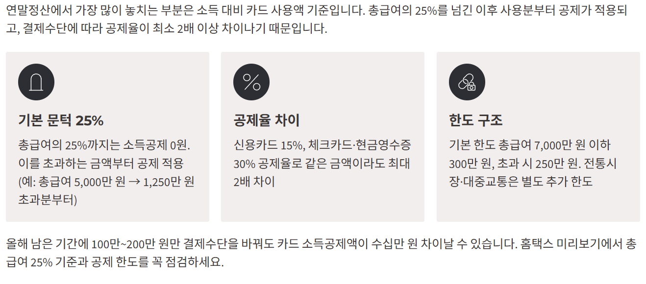 - 마감 리스크 : 2025년 12월 소비 패턴을 미리 조정하지 않으면, 총급여의 25% 기준이나 카드 공제 한도를 제대로 활용하지 못해 공제 누락이 발생할 수 있습니다.