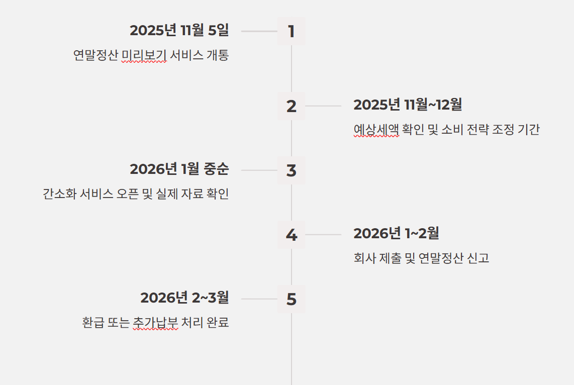 - 실제 연말정산 신고 : 2026년 1월 중순 홈택스 간소화 서비스 오픈 후, 1~2월 사이 회사 제출 및 2~3월 환급·추가납부 처리 예정.