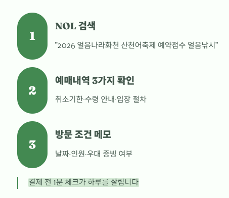 화천 산천어축제 예약방법의 핵심은 “결제 완료”가 아니라 “예매내역 확인(취소·수령·입장)”까지 끝내는 것입니다.