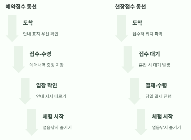 - 현장접수(당일): 도착 → 접수 대기 → 결제/수령 → 입장 확인 → 체험