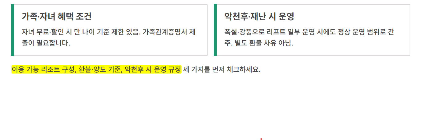 - 악천후·재난 시 운영: 폭설·강풍·우박·정부 지침 등으로 리프트·곤돌라가 일부만 운영되더라도, 약관상 정상 운영 범위로 간주되어 별도의 환불 사유가 되지 않는 경우가 많습니다.