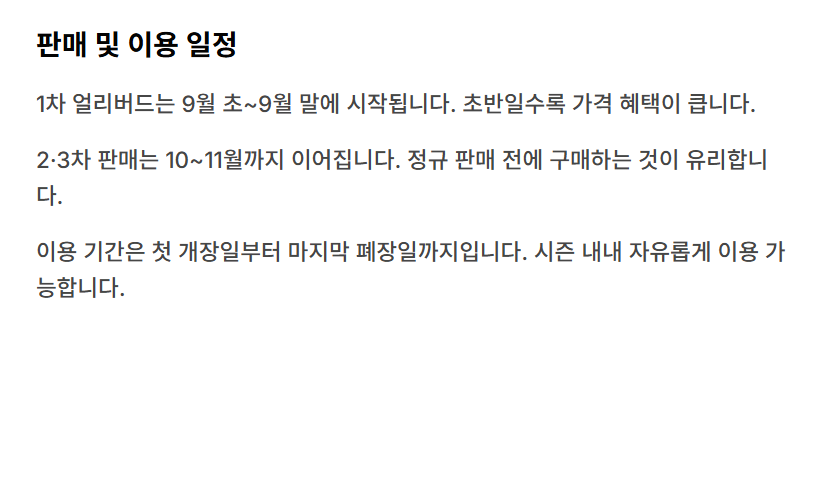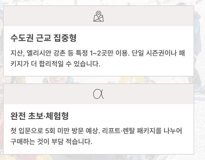 - 이후 가족·자녀 동반 여부, 셔틀·숙박·렌탈 계획, 환불·양도 조건까지 함께 고려해 자신에게 맞는 시즌권 종류를 선택합니다.