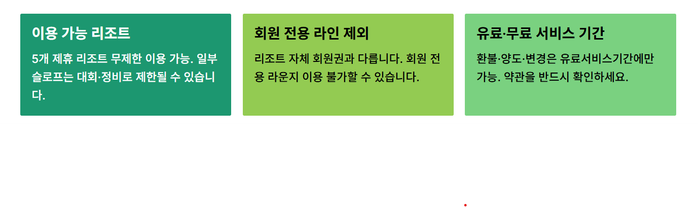 - 이용 가능 리조트: 모나용평, 하이원, 웰리힐리, 지산 포레스트, 엘리시안 강촌 등 5개 제휴 리조트를 무제한 이용할 수 있지만, 각 리조트의 일부 슬로프나 리프트는 대회·정비 등 사유로 예고 없이 제한될 수 있습니다.