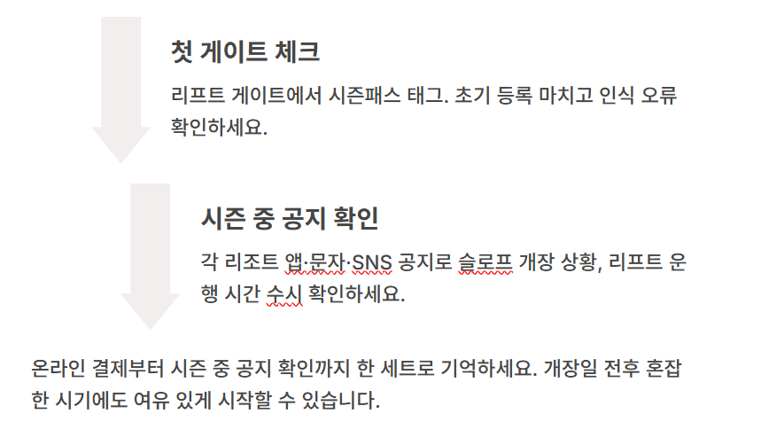 - 첫 게이트 체크: 첫 방문 시 리프트 게이트에서 시즌패스를 태그해 초기 등록을 마치고, 인식 오류가 없는지 바로 확인하신 뒤 슬로프로 이동합니다.