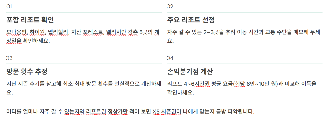 - 수도권 근교 집중형: 지산, 엘리시안 강촌 등 특정 1~2곳만 주로 이용한다면, X5 통합권보다 해당 리조트 단일 시즌권 또는 리프트 패키지가 더 합리적일 수 있습니다.