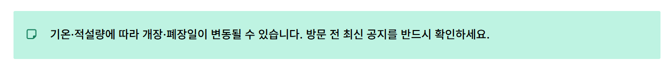 - 변동 가능성: 기온·적설량·제설 여건에 따라 개장·폐장일이 앞당겨지거나 지연될 수 있어, 방문 전에는 반드시 최신 공지를 다시 한 번 확인하는 것이 안전합니다.
