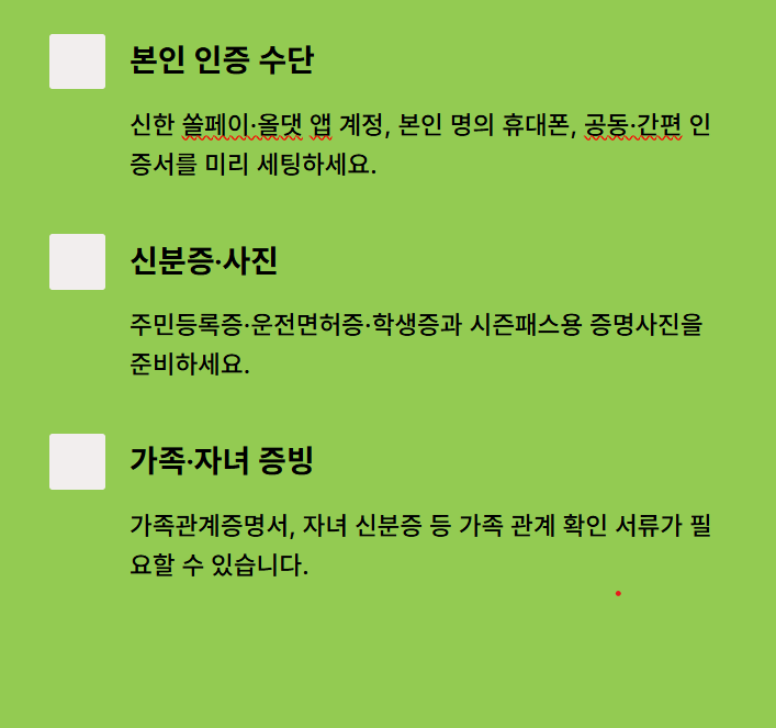 - 본인 인증 수단: 신한 쏠페이·올댓 앱 등 판매 채널 계정, 본인 명의 휴대폰, 공동·간편 인증서 등 기본 본인 인증 수단을 미리 세팅해 둡니다.