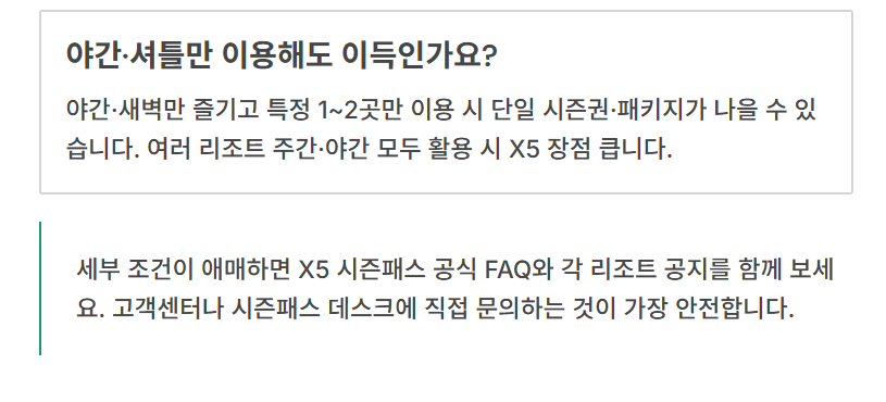 - Q. 야간 스키나 셔틀만 주로 이용해도 X5 시즌권이 이득일까요? A. 야간·새벽 시간대만 간단히 즐길 계획이고, 특정 한두 리조트만 이용한다면 단일 시즌권 또는 야간·셔틀 패키지가 더 나을 수 있습니다. 여러 리조트를 번갈아 다니며 주간·야간을 모두 활용할 계획일 때 X5 통합권의 장점이 더 크게 살아납니다.