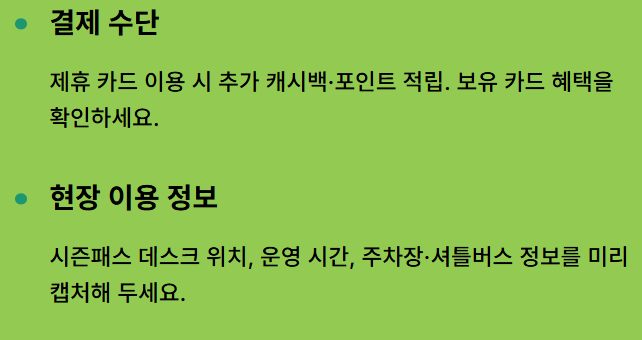 - 현장 이용 정보: 시즌패스 데스크 위치, 운영 시간, 주차장·셔틀버스 위치 등 기본 동선 정보를 미리 캡처해 두면 개장 주말처럼 혼잡한 날에도 당황하지 않고 바로 움직일 수 있습니다.