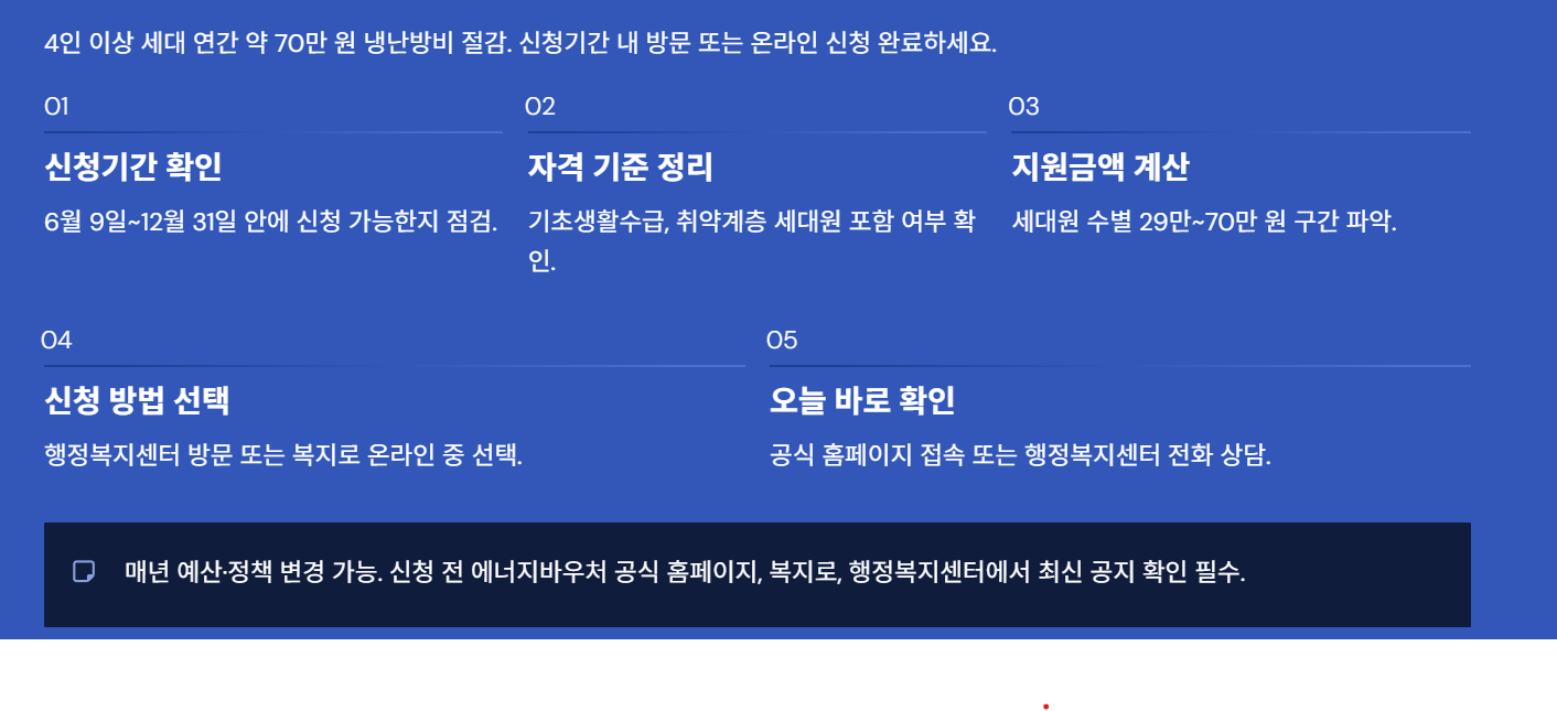 다만 에너지바우처는 매년 예산·정책·운영 방식에 따라 지원금액과 신청·사용기간, 대상 기준이 조금씩 달라질 수 있습니다.