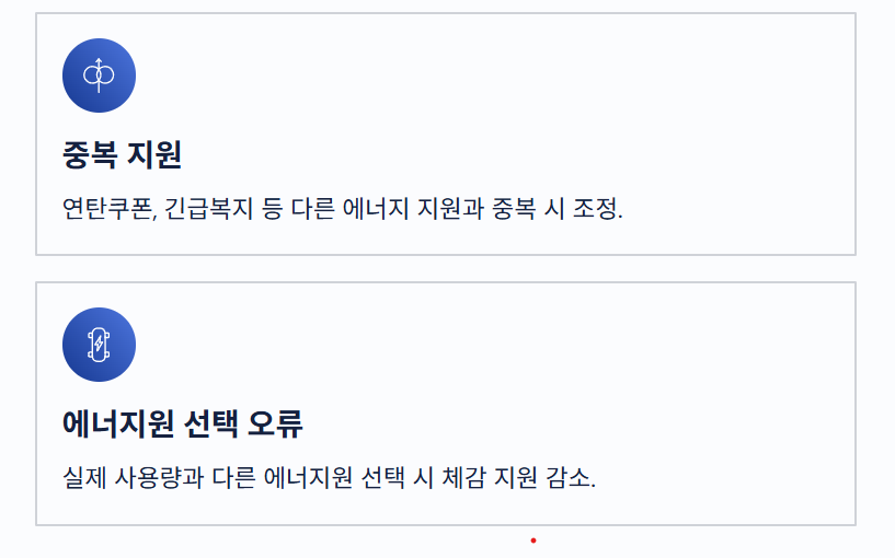 - 다른 에너지 지원과의 중복: 연탄쿠폰, 긴급복지 연료비, 지자체별 난방 지원 등과 중복되는 경우 지원 방식이나 금액이 조정될 수 있어, 중복 지원 여부를 미리 알려 주는 것이 안전합니다.