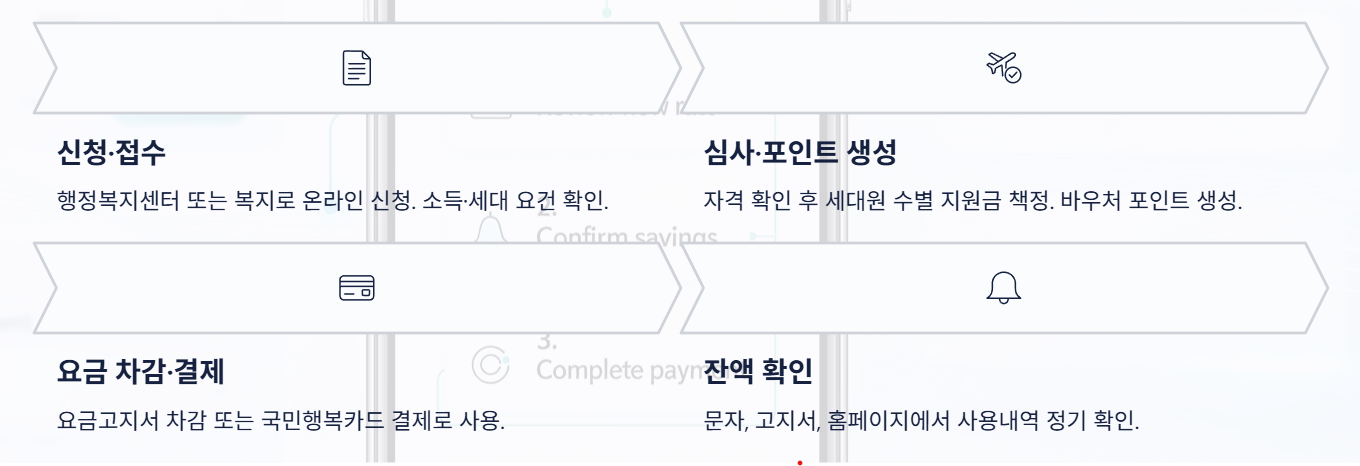 - 요금 차감·카드 결제 단계: 요금차감 방식을 선택했다면 전기·가스·지역난방 요금고지서에서 바우처 포인트가 우선 차감되고, 카드 방식을 선택했다면 국민행복카드 결제액에서 바우처 금액이 먼저 사용됩니다.