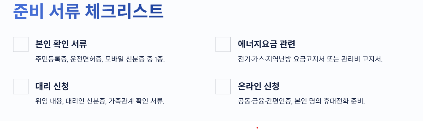 - 행정복지센터 방문이 편한지, 복지로 온라인 신청이 편한지 선택한 뒤, 신분증·요금고지서·수급 관련 증명·인증수단 등 기본 준비물을 미리 챙겨 두세요.