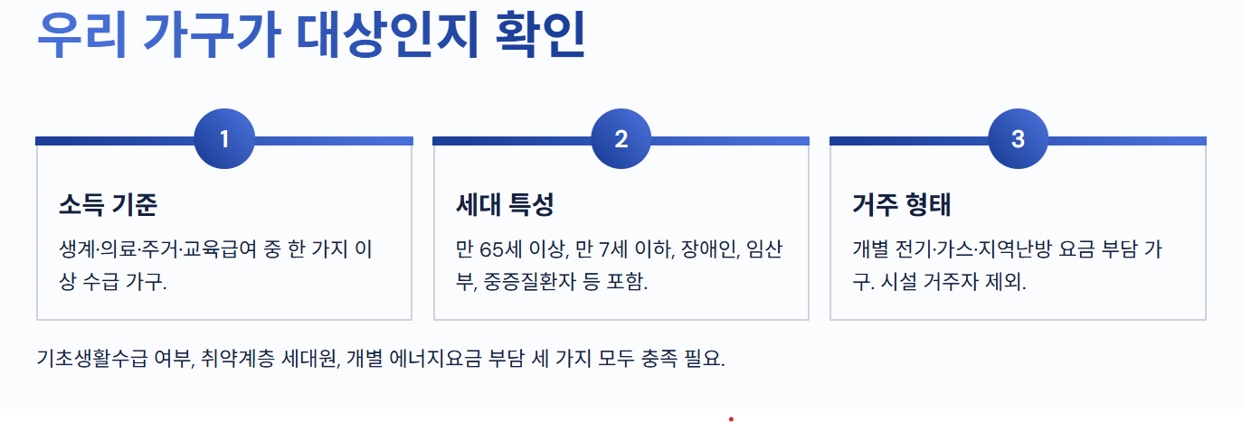 - 거주 형태 기준: 일반 주택·아파트 등에서 개별 전기·가스·지역난방 요금을 부담하는 가구가 주 대상이며, 양로원·보육시설 등 시설 거주자는 제도 특성상 지원 대상에서 제외되는 경우가 많습니다.