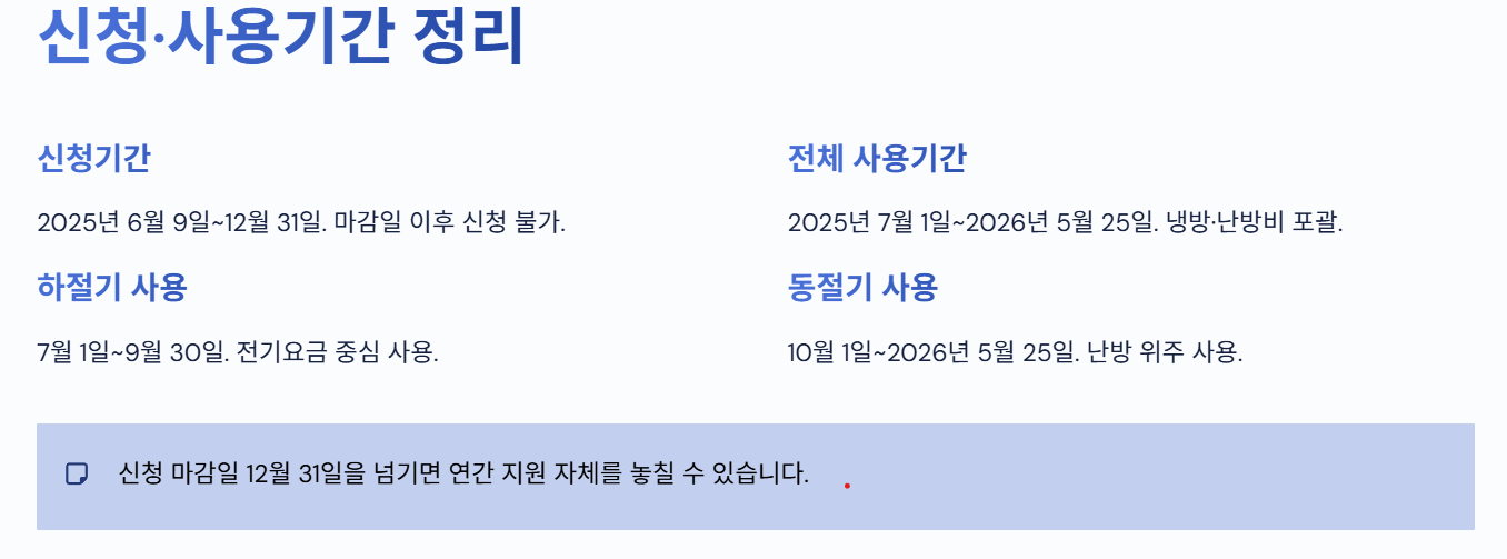 2025년 기준 안내에 따르면 신청기간은 6월 9일 ~ 12월 31일, 사용기간은 2025년 7월 1일 ~ 2026년 5월 25일까지로, 여름·겨울 에너지비를 모두 포함할 수 있도록 운영됩니다.