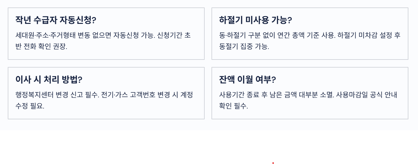 에너지바우처는 안내문이 제공되지만, 실제로는 자동신청 여부, 하절기·동절기 사용 방식, 이사·세대 변경, 잔액 소멸과 관련된 질문이 많이 들어옵니다.