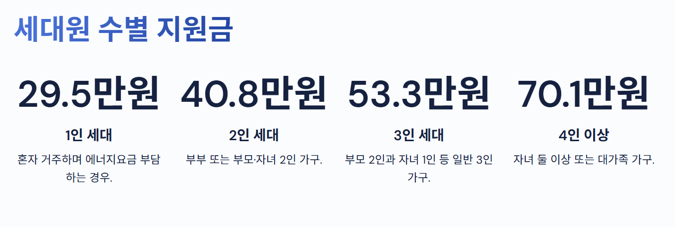 - 세대원 수에 따라 약 29만 원에서 70만 원대까지 어느 지원 구간에 속하는지 대략적인 금액을 계산해 보시고, 이 금액이 우리 집 에너지비에 어느 정도 도움이 될지 가늠해 보세요.