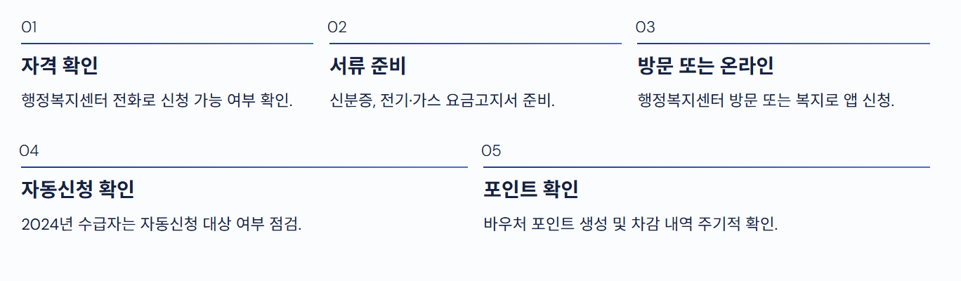 에너지바우처는 신청서를 제출한 직후 바로 현금이 입금되는 방식이 아니라, 심사와 포인트 생성 단계를 거쳐 요금 차감 또는 카드 결제로 연결되는 구조입니다.