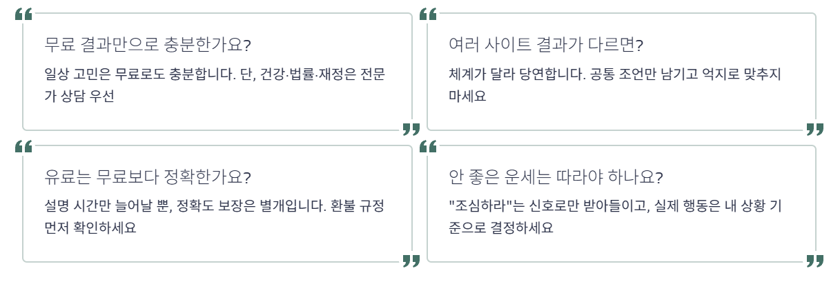 - Q. 무료 결과만 보고 판단해도 될까요? A. 일상적인 고민이라면 무료 결과만 가볍게 참고해도 충분한 경우가 많습니다. 다만 건강·법률·재정처럼 실제 손해가 수십만 원 단위로 커질 수 있는 영역은, 운세보다 전문가 상담과 공식 정보를 먼저 보는 편이 훨씬 안전합니다.