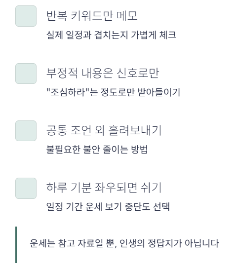 - 운세에서 반복해서 언급되는 키워드나 시기를 간단히 메모해 두고, 실제 일정과 겹치는지만 가볍게 체크합니다.