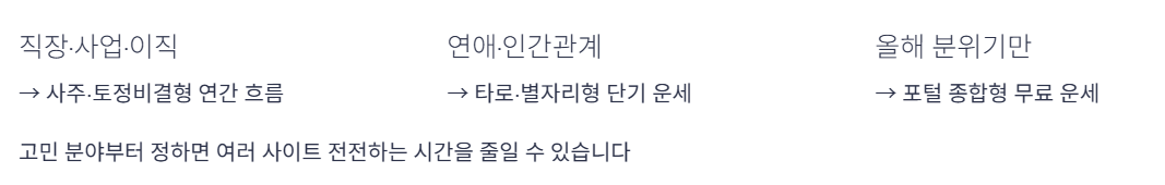 - 직장·사업·이직이 고민이라면, 연간 흐름과 재물운을 보는 사주·토정비결형 무료 운세가 상대적으로 도움이 될 수 있습니다.