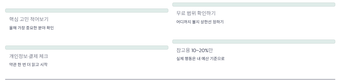 - 올해 한 번 “무료는 여기까지만, 유료는 이럴 때만”이라는 기준을 만들어 두면, 매년 같은 패턴으로 선택할 수 있어 돈과 시간을 아낄 수 있습니다.