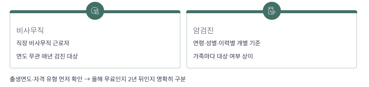 - 암검진·추가검사는 연령·성별·질환 이력에 따라 대상 여부가 달라, 같은 집안에서도 누군가는 무료 암검진 대상인데 다른 가족은 해당이 안 될 수 있습니다.