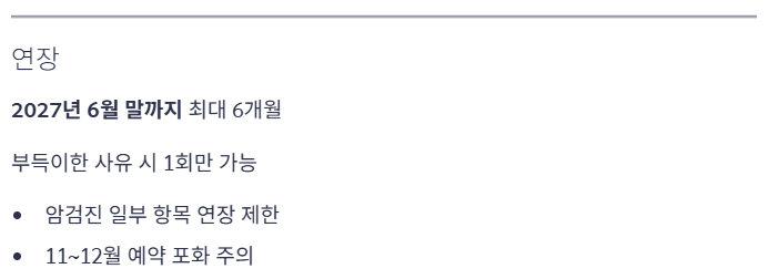 부득이한 경우에 한해 신청을 통해 2027년 6월 말까지 한 번 연장할 수 있지만, 이마저도 기한을 넘기면 다시 돌려받을 수 없고 암검진처럼 연장이 제한되는 항목도 있습니다.