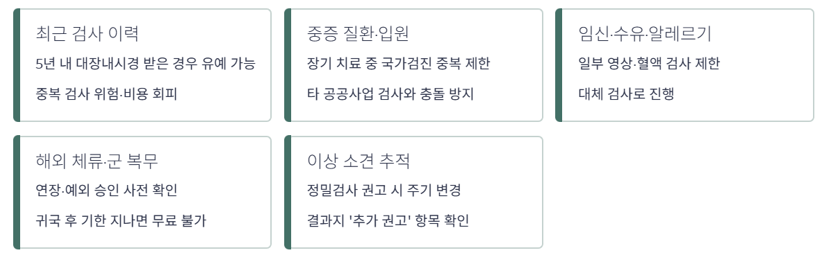 국가건강검진은 기본 대상 기준 외에도 과거 검사 이력·치료 이력·건강 상태에 따라 유예·제외가 되는 경우가 많습니다.