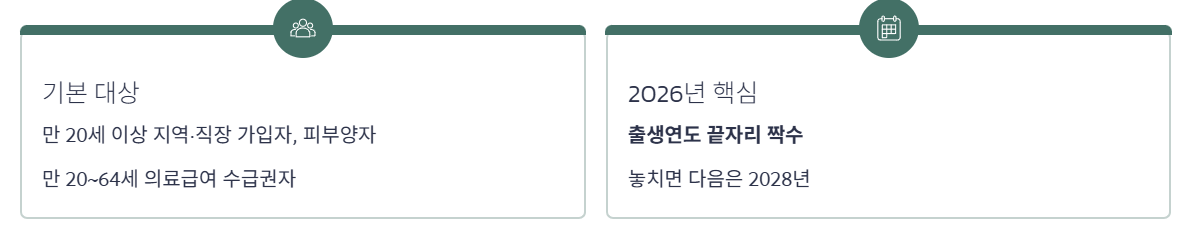 - 2026년은 짝수 해이므로 보통 출생연도 끝자리가 짝수인 사람이 2년 주기 일반검진 대상에 해당하며, 이번 해를 놓치면 다음 무료 검진은 2년 뒤로 밀립니다.
