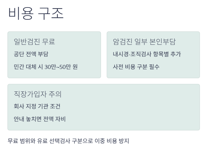 - 위·대장 등 암검진에서 내시경·조직검사 등을 선택하면 검사 항목에 따라 본인부담금이 추가되므로, 무료 부분과 유료 부분을 미리 구분해 두는 것이 중요합니다.
