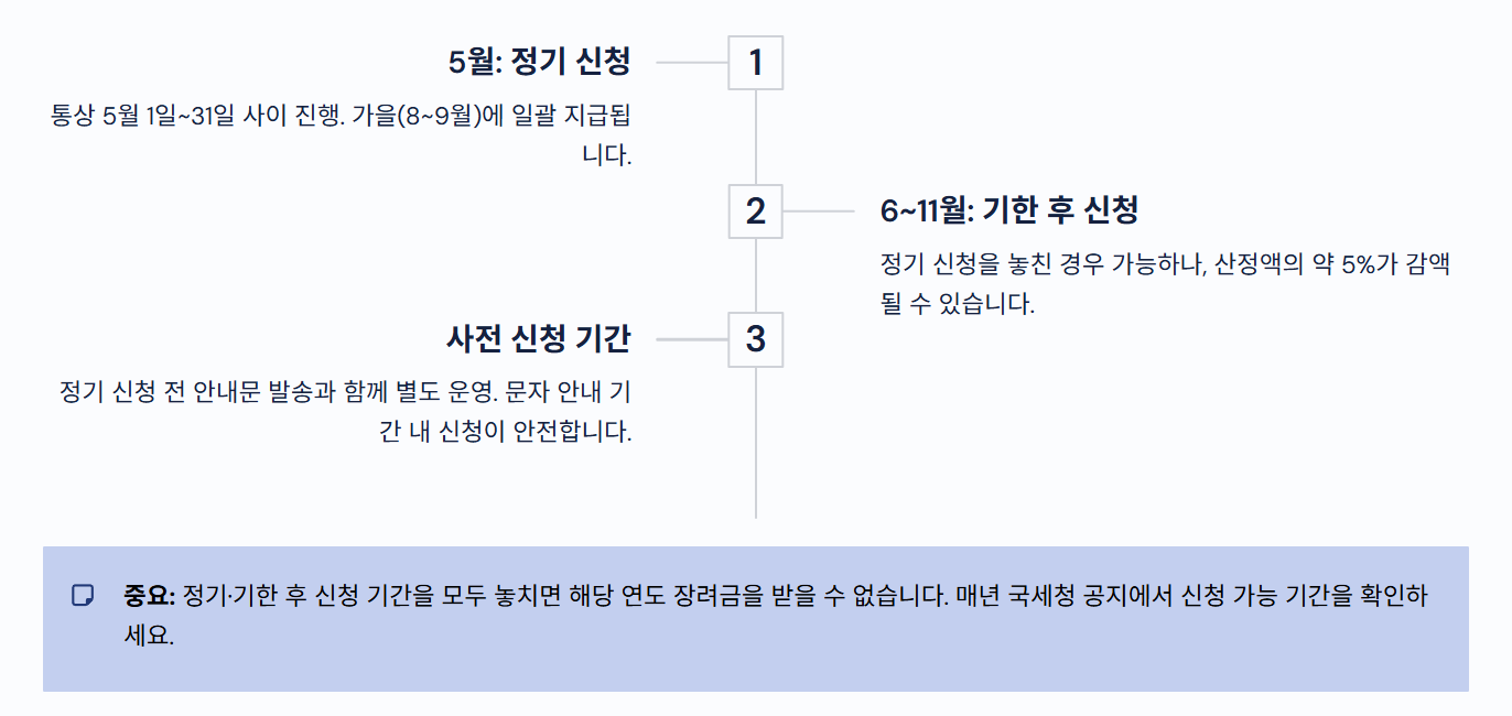 - 기한 후 신청은 대체로 6월 1일~11월 30일까지 가능하지만, 이때는 산정액의 일부(5% 수준)가 감액될 수 있습니다.