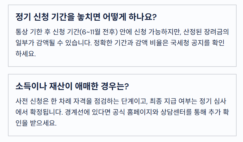- 정기·기한 후 신청 기간을 모두 놓치면 해당 연도 장려금을 받을 수 없을 수 있으니, 매년 국세청 공지에서 신청 가능 기간을 한 번 더 확인해 두시는 것이 좋습니다.