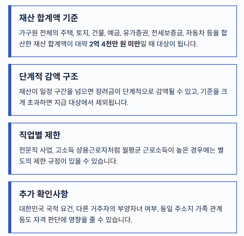 - 재산이 일정 구간을 넘으면 장려금이 단계적으로 감액될 수 있고, 기준을 크게 초과하면 장려금 지급 대상에서 제외될 수 있습니다.