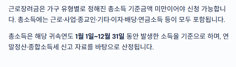 - 근로장려금은 가구 유형별로 정해진 총소득 기준금액 미만이어야 신청할 수 있으며, 이 총소득에는 근로·사업·종교인·기타·이자·배당·연금소득 등이 모두 포함됩니다.