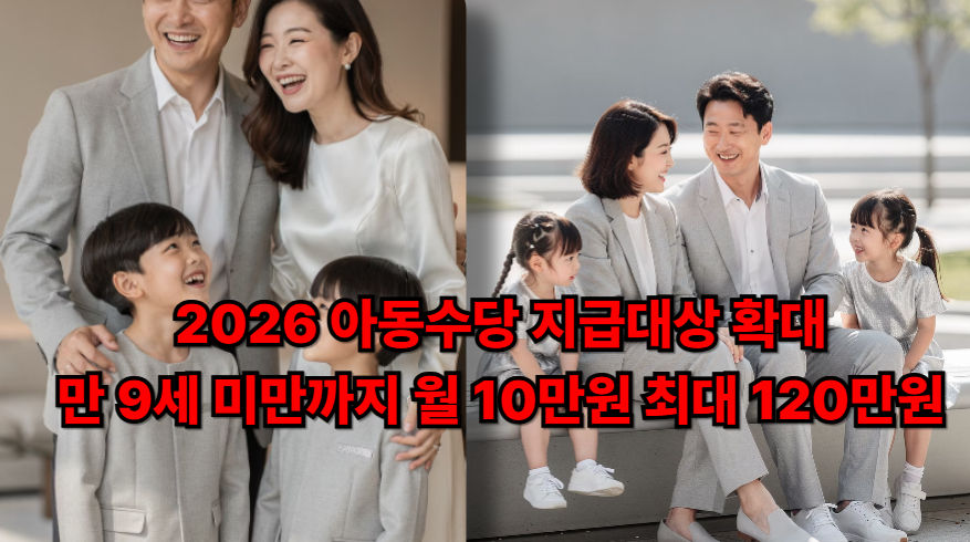 정부 발표 기준으로 2026년 1월부터 아동수당이 ‘만 9세 미만(0~107개월)’까지 단계 확대가 추진·안내되고 있습니다. 기존 만 8세 미만에서 종료됐던 가정은 ‘최대 12개월’ 추가 구간이 생기면 최대 120만원(10만원×12개월) 차이가 날 수 있어요.