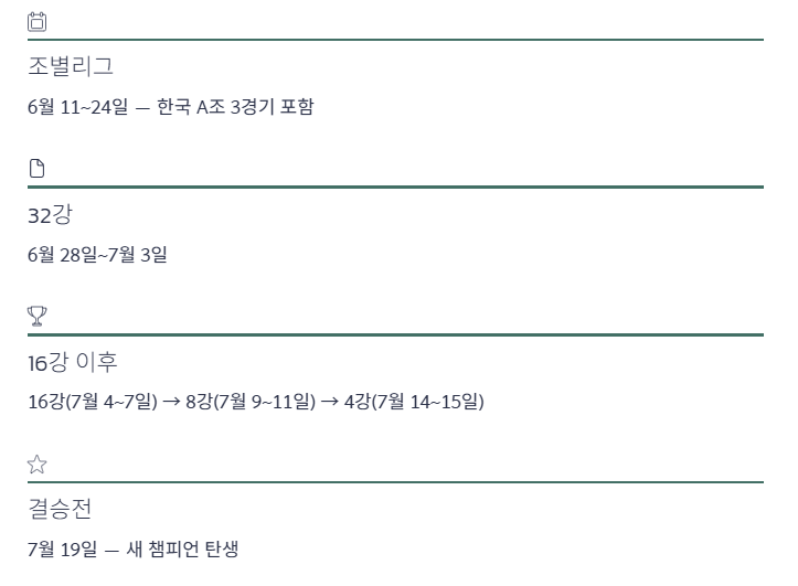 - 조별리그: 6월 11~24일, 한국 A조 3경기 포함 – 이 구간에 연차·근무 조정이 몰릴 수 있습니다.