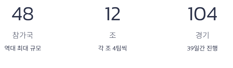 - 대회 일정은 2026년 6월 11일~7월 19일로 확정되어, 39일간 104경기가 진행됩니다.